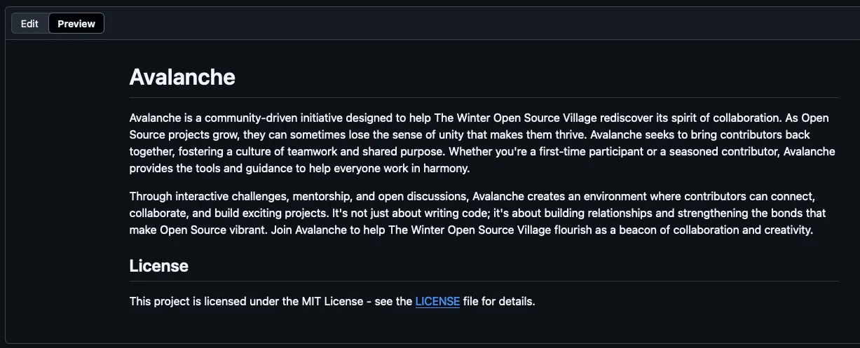 README.md # AvalancheAvalanche is a community-driven initiative designed to help The Winter Open Source Village rediscover its spirit of collaboration. As Open Source projects grow, they can sometimes lose the sense of unity that makes them thrive. Avalanche seeks to bring contributors back together, fostering a culture of teamwork and shared purpose. Whether you're a first-time participant or a seasoned contributor, Avalanche provides the tools and guidance to help everyone work in harmony.Through interactive challenges, mentorship, and open discussions, Avalanche creates an environment where contributors can connect, collaborate, and build exciting projects. It's not just about writing code; it's about building relationships and strengthening the bonds that make Open Source vibrant. Join Avalanche to help The Winter Open Source Village flourish as a beacon of collaboration and creativity.## LicenseThis project is licensed under the MIT License - see the [LICENSE](LICENSE) file for details.